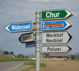 - Die Knotenpunkte selber (Dorfmitte) werden meist nicht beschriftet, sondern an der Abgrenzung von Ausserorts- zu Innerortszonen werden Ortstafeln platziert (Details zu Ortstafeln vgl. hier). Ortstafeln dienen Verkehrsteilnehmern zur Bestätigung, dass sie einen bestimmten Verkehrsknoten oder die Zielortschaft erreicht haben.