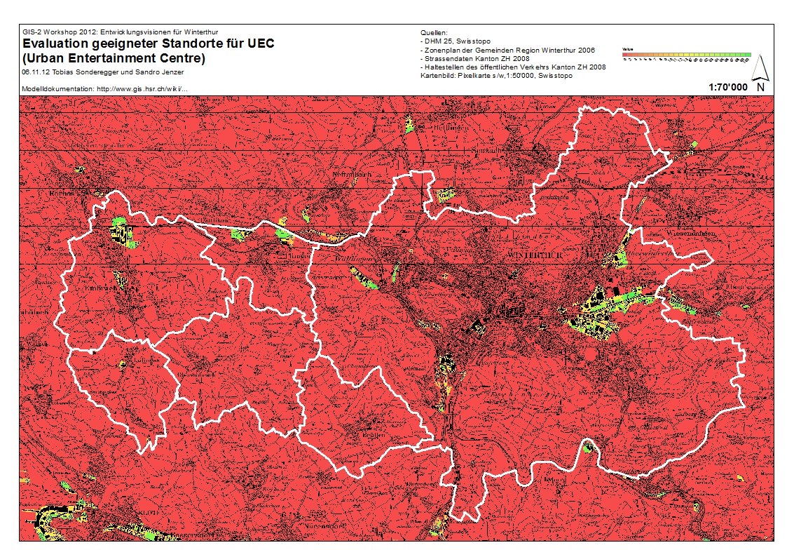 Karte zur Evaluation von geeigneten Standorten für UEC im Raum Winterthur