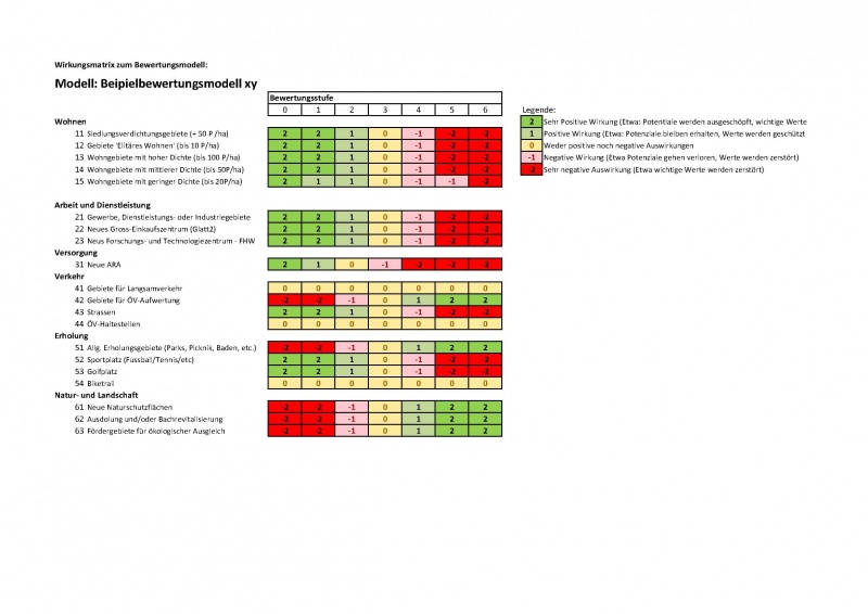 Anhand einer Bewertungsmatrix werden die Auswirkungen der Inhaltstypen aus dem Planungsprogramm auf die Flächen der naturnahen Naherholung eingestuft/abgeschätzt.