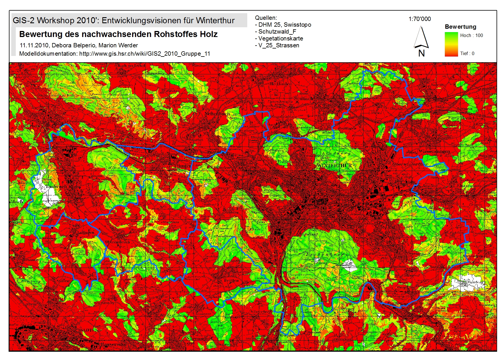 Nach der Bewertung der einzelnen Faktoren wurden die verschiedenen Ergebnisse zu einer Bewertungskarte zusammengefügt. Dazu musste das Modell mit der Funktion Single Output Map Algebra erweitert werden. Diese Formel wurde mit einer zusätzlichen Bewertung ergänzt: Die Waldgesellschaften erhalten den Wert 1, die restlichen Flächen, welche keine Waldflächen sind, erhalten den Wert 0. Diese Werte wurden dann mit der Formel der Gewichtung multipliziert. Dies gilt auch für den Schutzwald. Durch die Multiplikation der Faktoren "Schutzwald" und " Wüchsigkeit" mit den anderen Faktoren, erreicht man, dass das Siedlungsgebiet und der Schutzwald rot dargestellt wird. Die restlichen Faktoren wurden zu einem Durchschnitt verrechnet.