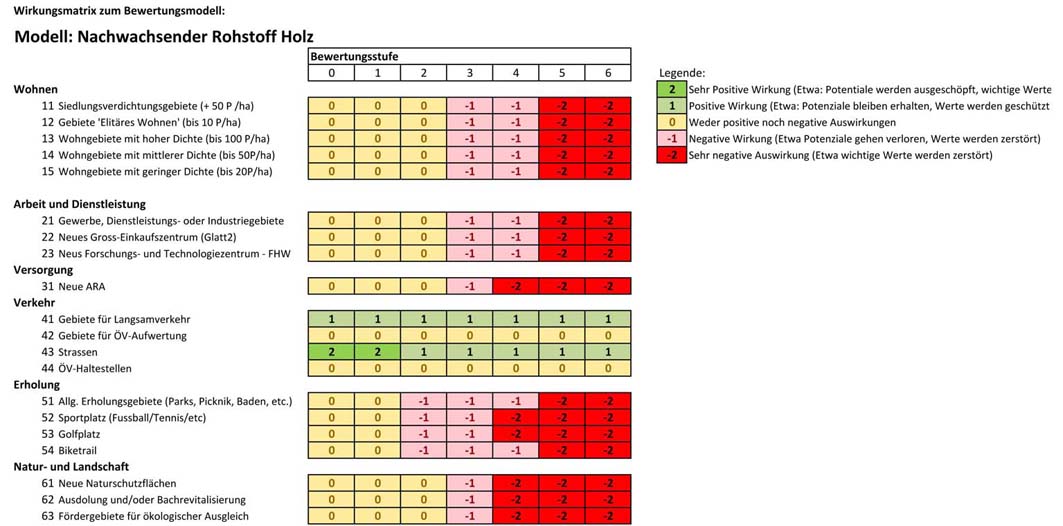 Anhand einer Wirkungsmatrix wurde entschieden, welche Faktoren positive oder negative Auswirkungen auf das Model des nachwachsenden Rohstoffes Holz haben. Alle Planung wurden danach anhand dieser Wirkungsmatrix bewertet.