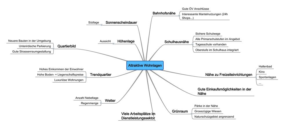 Unzählige Themen beeinflussen in unterschiedlichem Ausmass, ob die die Wohnlage attraktiv ist oder nicht. Das nachfolgende Mindmap stellt die wichtigsten Treiber dar.