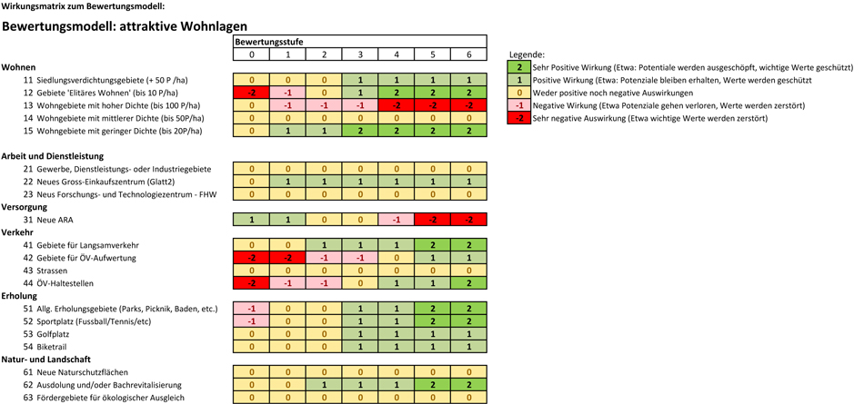 Mit der Bewertungsmatrix werden die Auswirkungen der Planungsthemen auf die attraktiven Wohnlagen eingestuft (Bereich von -2 bis +2).