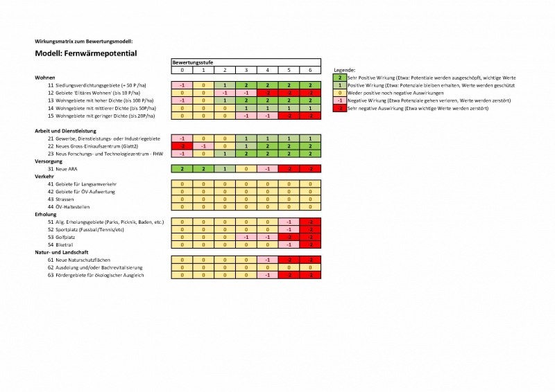 Mit der Bewertungsmatrix werden die Auswirkungen der Planungsthemen aus der Sicht des Fernwärmepotentiales eingestuft (Punkteverteilung von -2 bis +2).