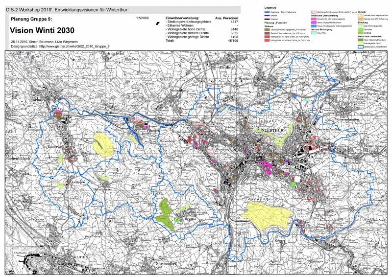 Für die Standortwahl der aus dem Planungprogramm ersichtlichen Inhalte wurden die Rasterdaten der verschiedenen Gruppen je nach Inhalt unterschiedlich gewichtet und überlagert. Die daraus resultierenden Bereiche dienen nebst dem gesunden Menschenverstand eine gute Grundlage für eine gezielte Einplanung geeigneter Standorte für die zukünftige Siedlungsentwicklung.