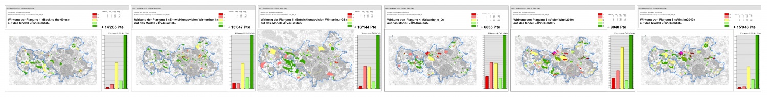 Basierend auf der Bewertungsmatrix für die Oev-Qualität wird nun mit jedem der von den Gruppen erstellten Visionsplänen eine Wirkungsanalyse durchgeführt. Mit dieser kann aufgezeigt werden, wie gut sich die unterschiedlichen Pläne jeweils auf auf die Oev-Qualität auswirken.