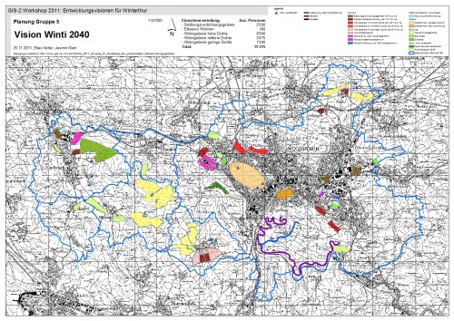 Für die Standortwahl der aus dem Planungsprogramm ersichtlichen Inhalte wurden die Rasterdaten der verschiedenen Gruppen je nach Inhalt unterschiedlich gewichtet und überlagert. Die daraus resultierenden Bereiche sind eine gute Grundlage für eine gezielte Planung geeigneter Standorte für die zukünftige Entwicklung der Region Winterthur.