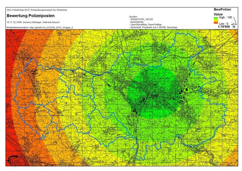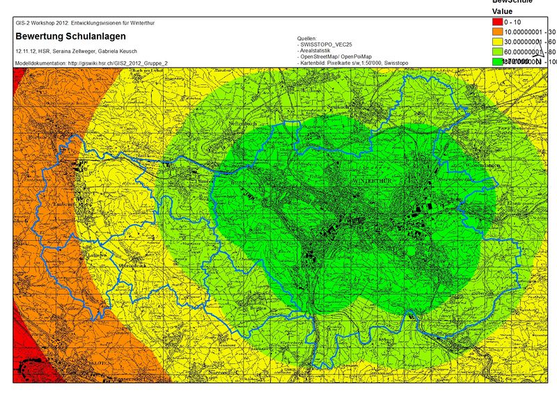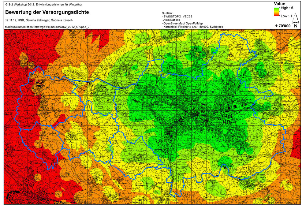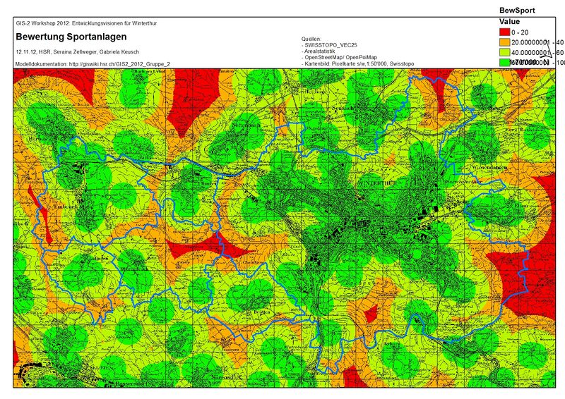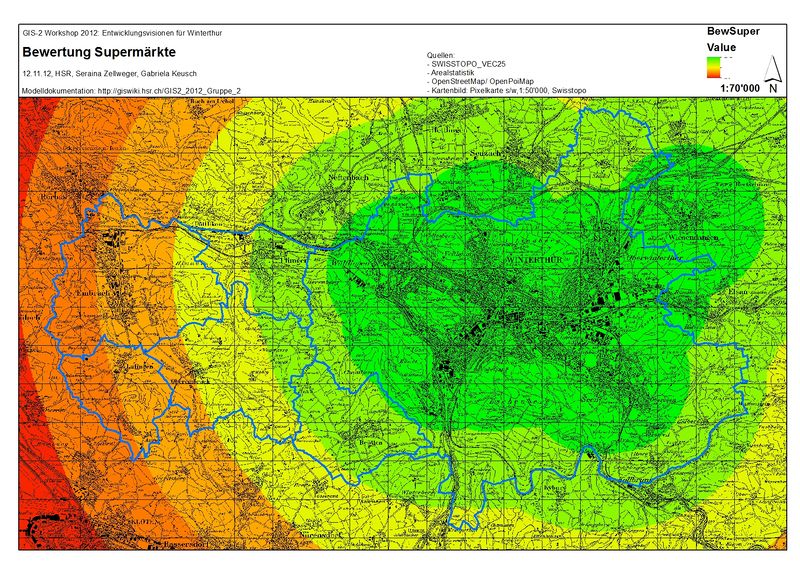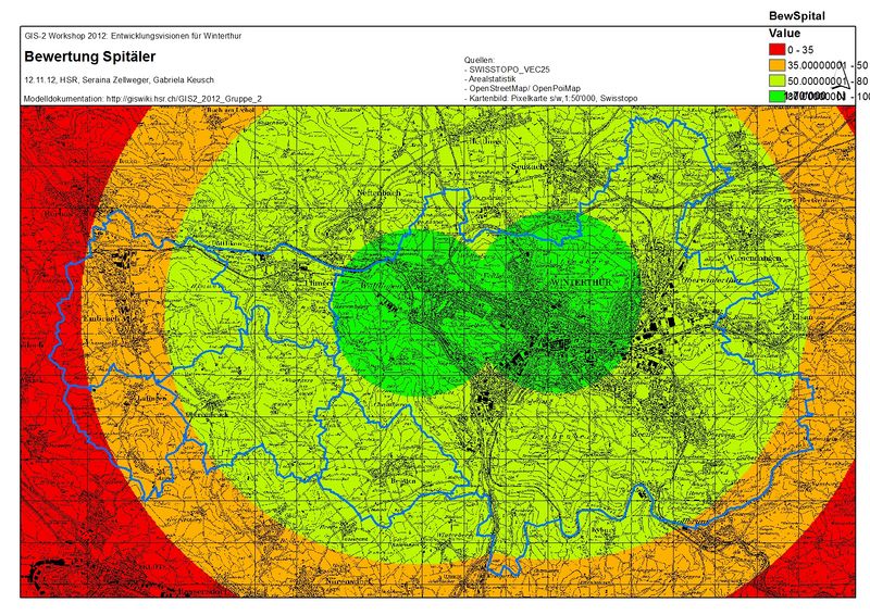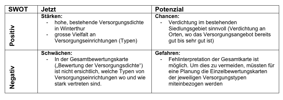 In unserem Modell schneiden alle Karten der anderen Gruppen sehr gut ab. Dies schliessen wir daraus, dass das gesamte Stadtgebiet Winterthur eine sehr hohe Versorgungsdichte aufweist. Dies wird in der SWOT-Analyse als Stärke aufgezeichnet.