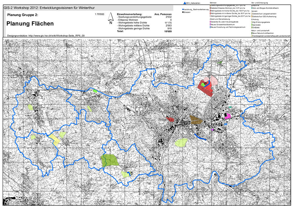 In Übung 2 geht es darum, die aus Übung 1 gewonnenen Erkenntnisse sinnvoll in die Planung einfliessen zu lassen. Dabei sollen verschiedene Gebiete ausgeschieden werden. Für diese Aufgabe dienten die Auswertungen der ersten Übung. Diese überlagerten wir themenspezifisch um geeignete Standorte für die auszuscheidenden Zonen und Gebiete zu evaluieren. Die Herausforderung lag für uns darin, eine geeignete Anzahl einzufliessende Kriterien zu definieren. Bei der Verschneidung von einer zu hohen Anzahl an Kriterien blieben keine geeigneten Standorte mehr übrig. Deshalb mussten wir uns auf eine limitierte Anzahl Kriterien beschränken.