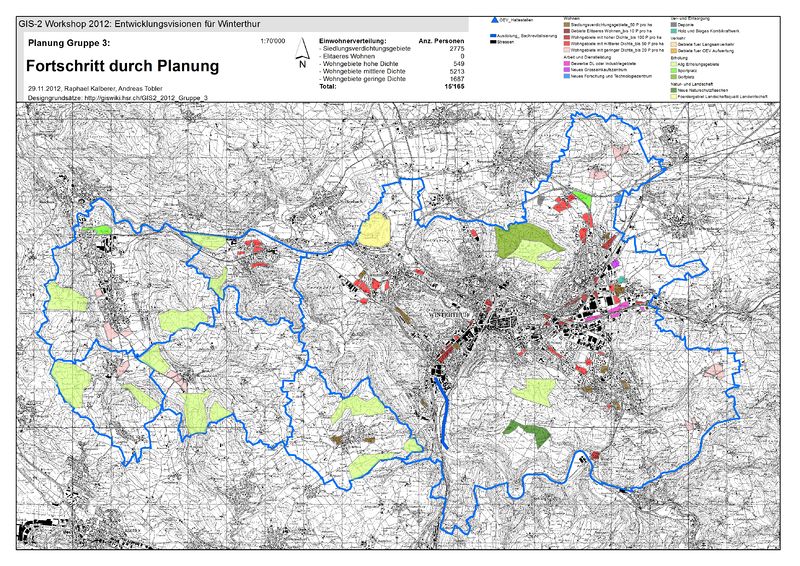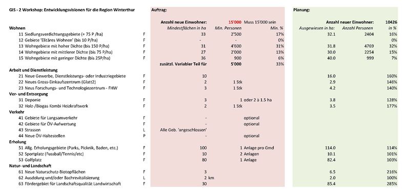 In der Übung 2 unseres Kurses GIS2 erarbeiteten wir eine Entwicklungsvision für Winterthur. Vorgegebene Mindestflächen für Wohnen, Arbeit und Dienstleistung, Ver- und Entsorgung, Verkehr, Erholung und Natur und Landschaft wurden anhand unserer Bewertungskarten der Übung 1 ausgeschieden. Die Mindestanzahl von neuen Einwohnern wurde auf 15'000 vorgeschrieben.