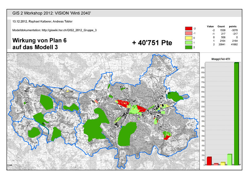 Die Planung der Gruppe 6 mit + 40'751 Punkten weist die geringsten Einschränkungen zu unserem Modell auf. Unsere Planung ist mit + 26'350 Punkten die zweit beste Planung für unser Modell. Auf dem dritten Platz folgt die Planung der Gruppe 4 mit + 13'115 Punkten. Die grössten Einschränkungen auf unser Wohnverdichtungs-Modell zeigen die Planungen der Gruppen 8 und 7. Die Gruppe 8 weist eine Punktzahl von + 6'212 und die Gruppe 7 eine Punktzahl von + 8'154 auf.