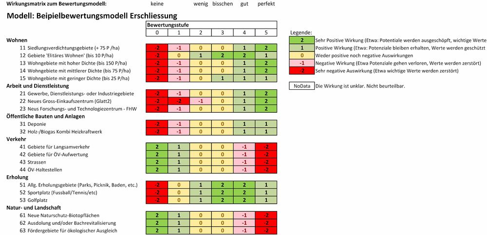 - Verkehr: Je höher die Erschliessungsqualität (weisse Zeile ganz oben), desto negativer wirken sich neue Verkehrsflächen aus.
