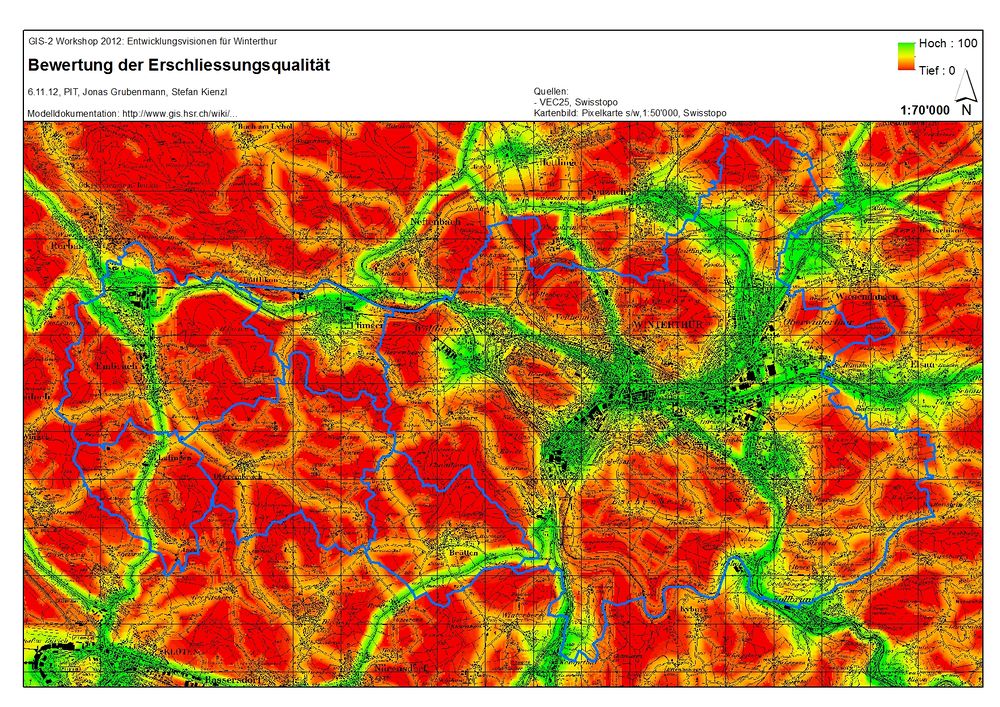 Die Bewertungskarte zeigt als Ergebnis des Funktionsmodells die Erschliessungsqualität im Raum Winterthur (MIV und ÖV kombiniert).