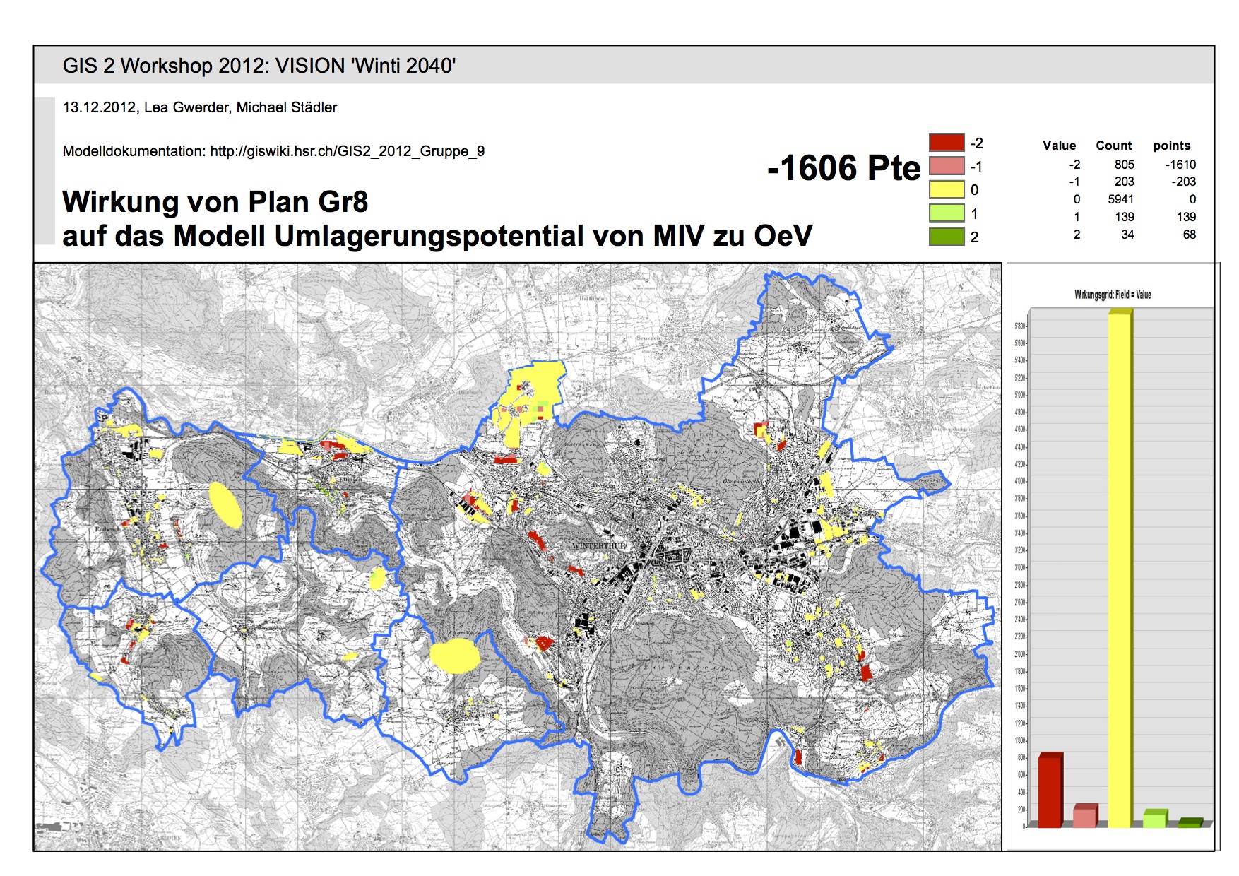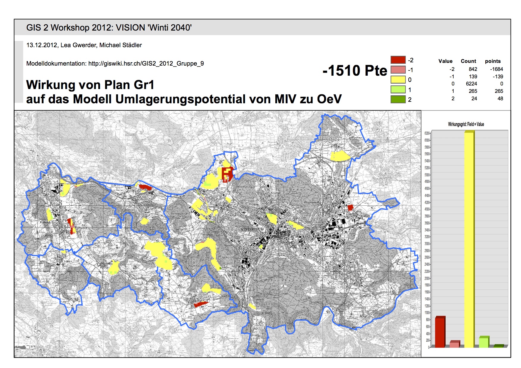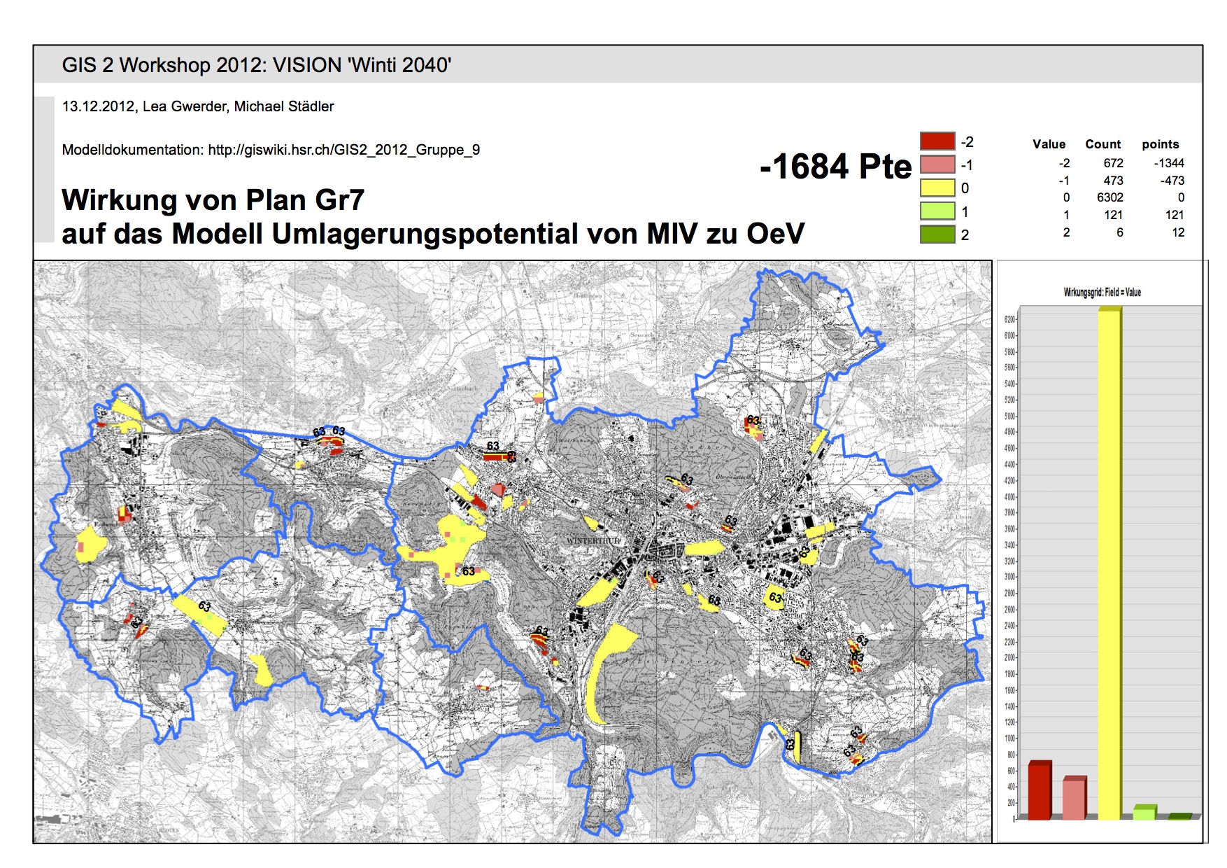 Nach Punktebwertung liegen die Graftiken 1, 2 und 8 auf den vorderen Rängen. Auf Grund unserer "0" Bewertung, kann jedoch keine abschliessende Beurteilung erfolgen. In einem weiteren Schritt müsste diese "0" nach Siedlungsgebiet bewertet werden. Die erzeugte Matrix kann folglich nur zu den Gebieten für die öV-Aufwertung und öV-Haltestellen relevante und richtige Aussagen machen.