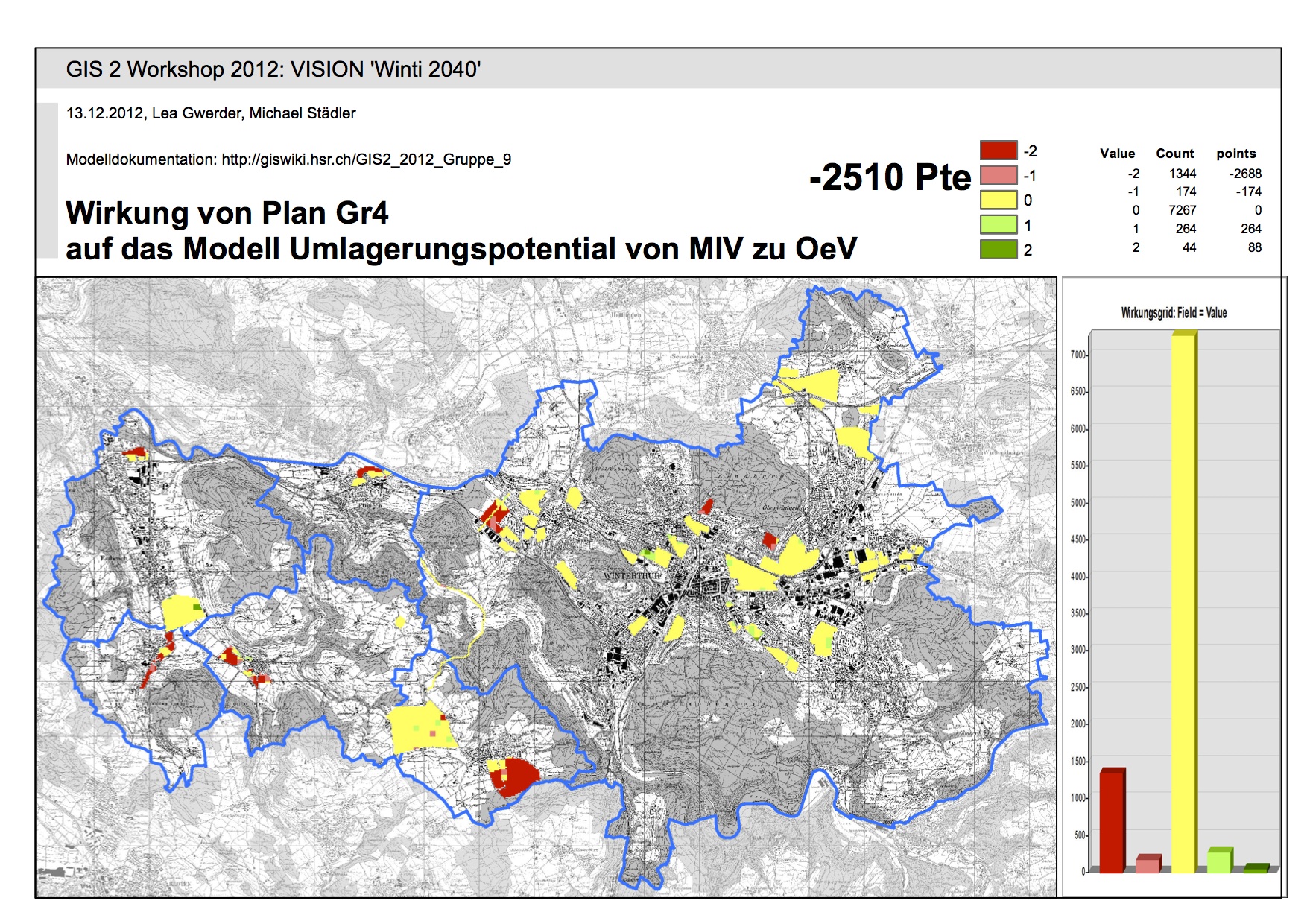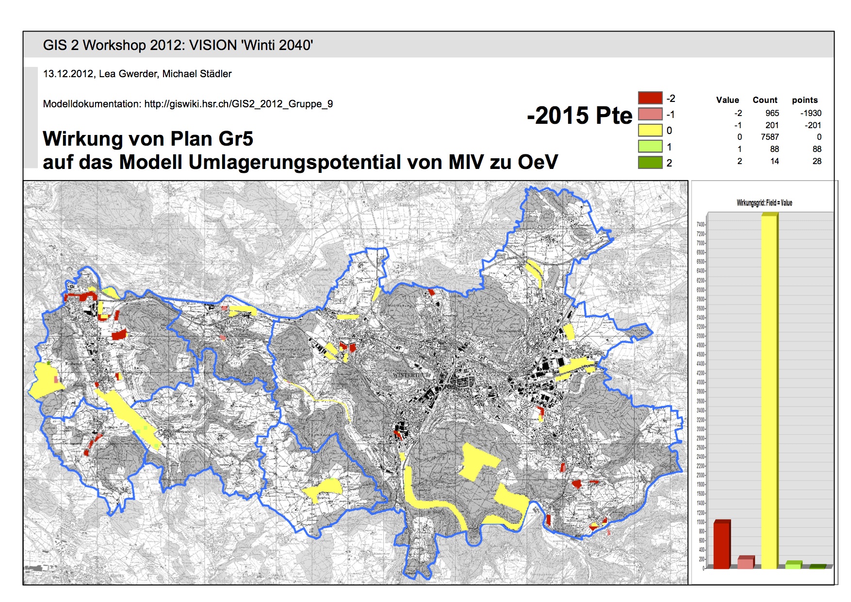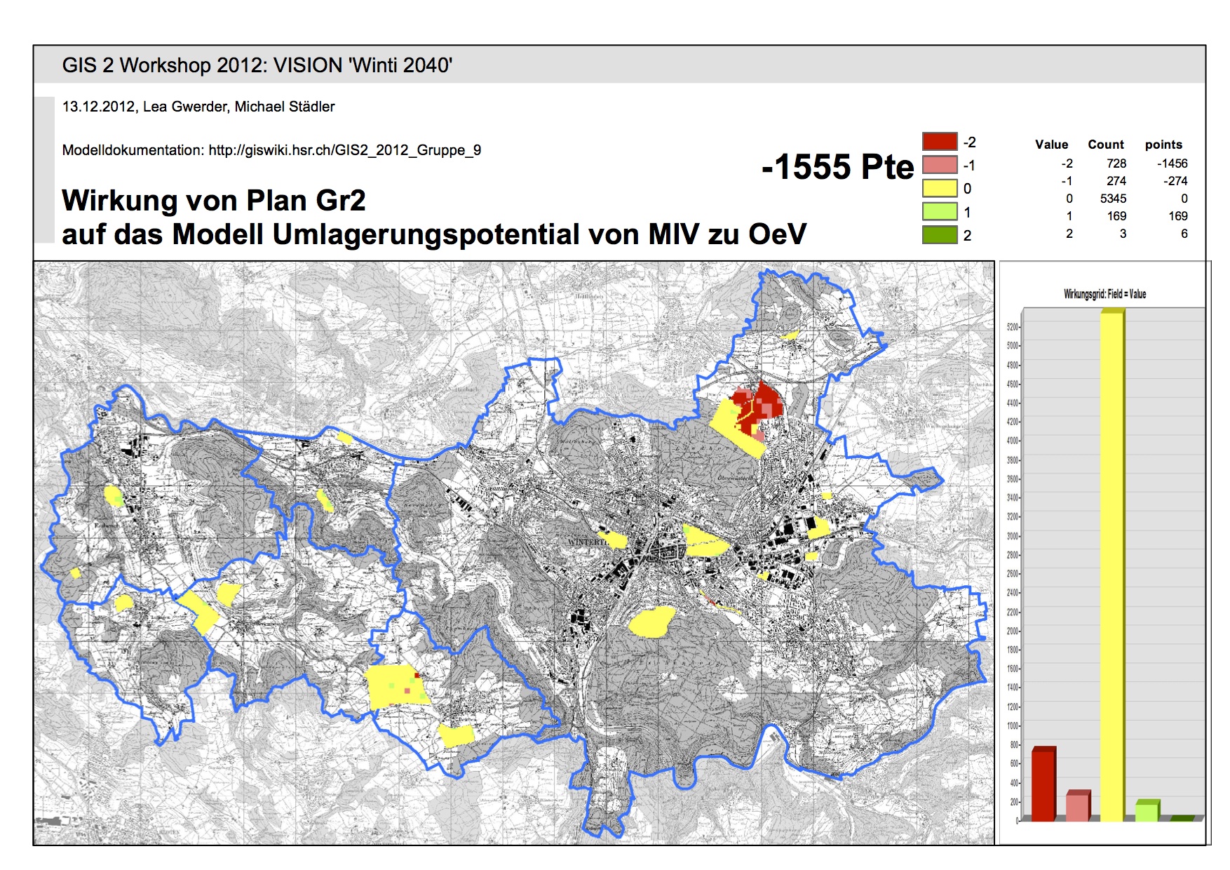 Nach Punktebwertung liegen die Graftiken 1, 2 und 8 auf den vorderen Rängen. Auf Grund unserer "0" Bewertung, kann jedoch keine abschliessende Beurteilung erfolgen. In einem weiteren Schritt müsste diese "0" nach Siedlungsgebiet bewertet werden. Die erzeugte Matrix kann folglich nur zu den Gebieten für die öV-Aufwertung und öV-Haltestellen relevante und richtige Aussagen machen.