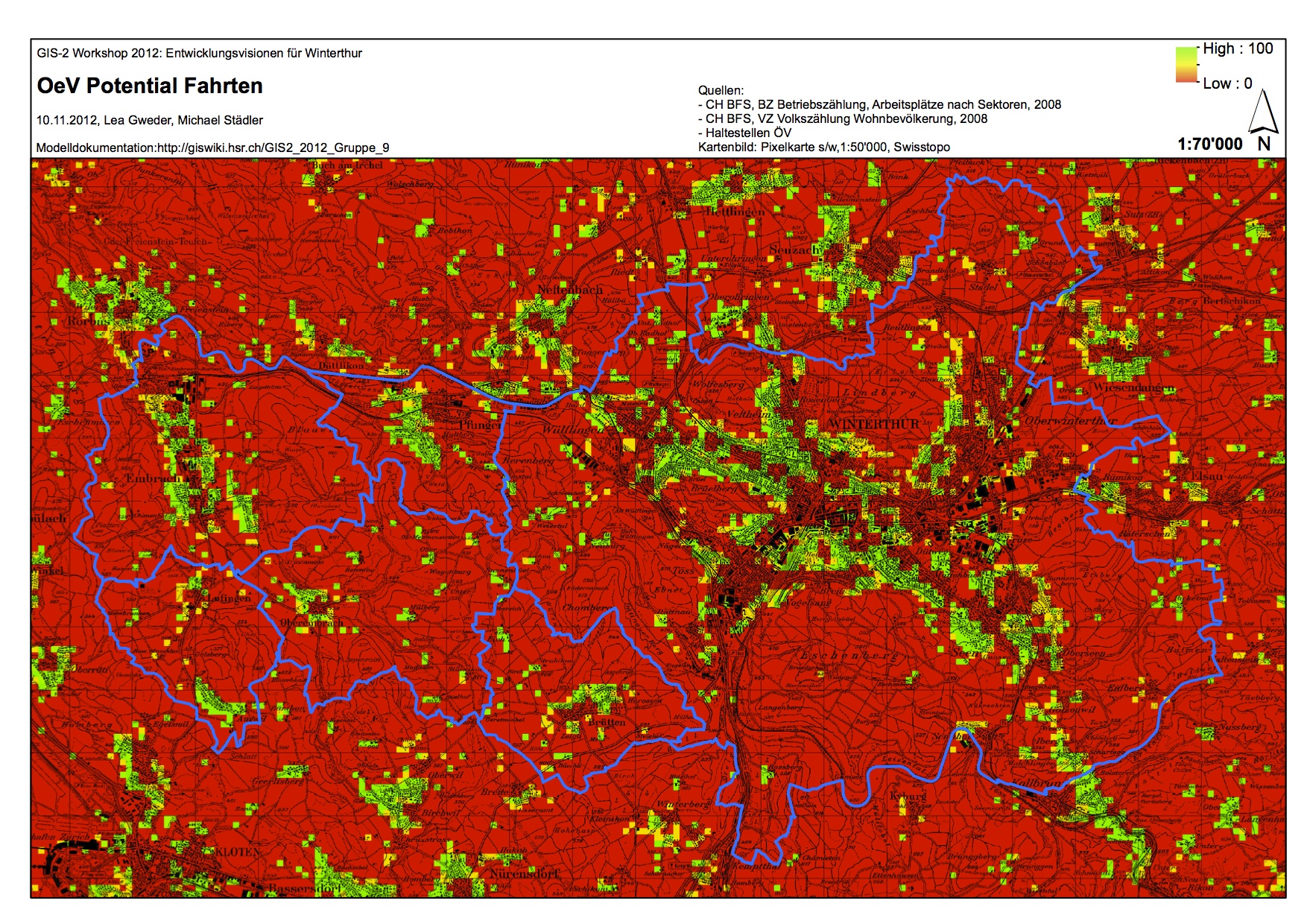 • Es müssten noch weitere Faktoren wie Linienführung OeV. Attraktoren und Publikumsintensive Anlagen etc. einflissen, respektive die bereits voillständig erschlossenen Gebiete mit einem Absolutwert (z.B. 100) versetzt werden, um eine gewichtige Aussage über das wirkliche Potential zu machen