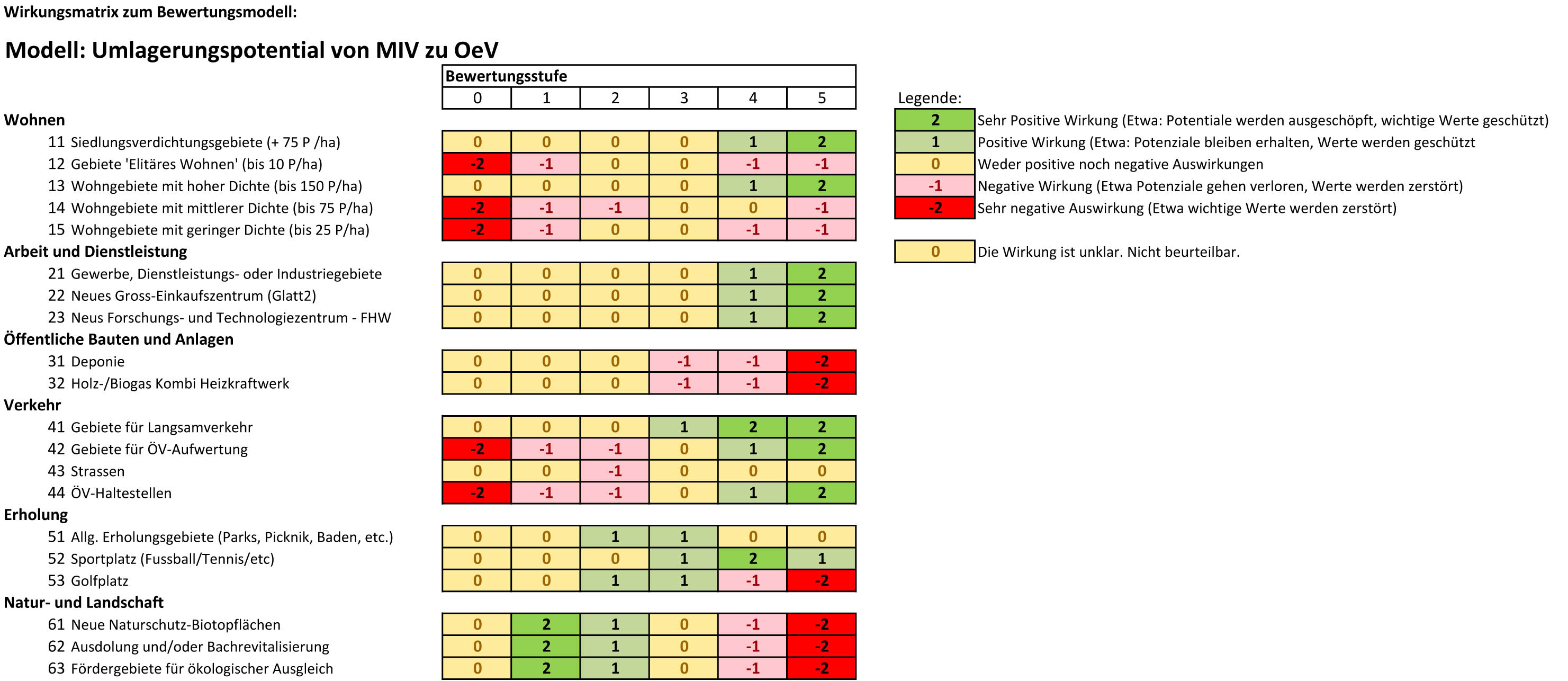 Die Schwierigkeit dieser Wirkungsmatrix ist es, dass keine Werte mit "no Data" eingefügt werden können. Ein Vergleich der Daten ist somit nur bedingt möglich. Grundsätzlich müsste das Gebiet weiter in funktionale Räume unterteilt werden. In diesen Teilräumen könnten dann wiederum sehr konkrete Aussagen über die Qualität der Planung gemacht werden.