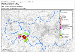 New City ist das unwahrscheinlichste aller Szenarien. Es versucht theoretisch herauszufinden, ob und an welcher Stelle in der Region Winterthur am eheseten etwas Neues entstehen kann. Das Ergebnis kann verschiedene Formen annehmen. Ein neuer Stadtteil am Rande Winterthurs, eine Satelitenstadt auf der grünen Wiese oder das starke expandieren einer kleineren Ortschaft neben Winterthur.