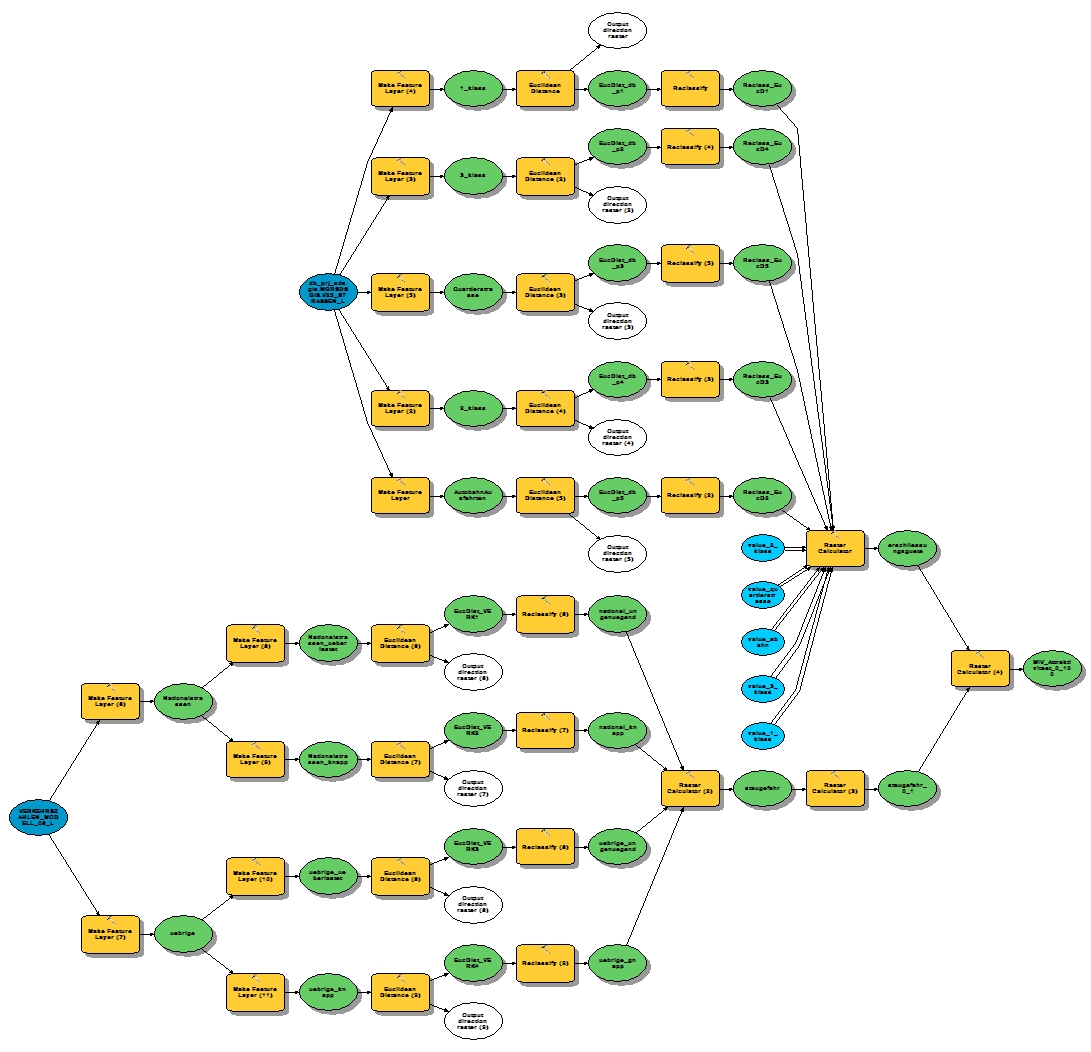 Die MIV-Erschliessungsgüte basiert auf der Berechnung des Abstandes zu den verschiedenen Strassenklassen gemäss Swisstopo. Im unten abgebildeten Modell wurden folgende Arbeitsschritte durchgeführt (oberer Strang):
