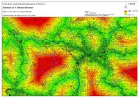 Aus den beiden Rastern zur Staugefahr und zur MIV-Erschliessungsgüte wird schliesslich die MIV-Attraktivität errechnet. Dies geschieht mit einer Multiplikation: Der Wert der Staugefahr, der jetzt eine Zahl zwischen 0 und 1 ist, wird mit der Erschliessungsgüte, Wert zwischen 1 und 100, verrechnet. Das führt dazu, dass bei Rasterfeldern ohne Staugefahr die Erschliessungsgüte zu 100% zählt, bei Feldern an total überlasteten Strassen dagegen der Wert 0 entsteht, sprich keine MIV-Nutzungen mehr möglich sind. Nach dieser Berechnung entsprechen die Werte 0-100.