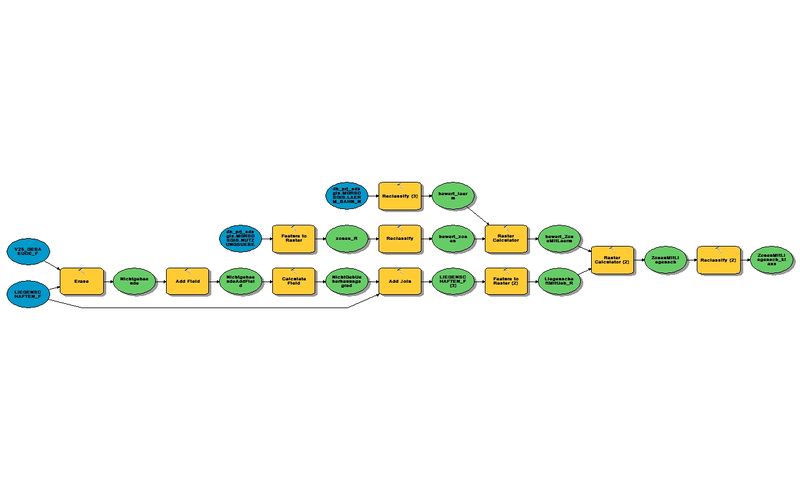Der zweite Schritt beinhaltet die Berechnung der unbebauten Restfläche auf den einzelnen Parzellen. Dabei wird die Fläche einer Parzelle mit der darauf befindlichen Gebäudefläche(n) verschnitten. Durch das Tool "add field" wird eine neue Spalte an die Attributentabelle angehängt in der mit "calculate field" die Liegenschaftsfläche durch die Gebäudefläche der Bebauungsgrad ausgerechnet werden kann. Diese Information wird danach an den Layer mit den Liegenschaften angehängt, so dass zur Liegenschaftsgösse sogleich auch der Bebauungsgrad abgelesen werden kann. Mit feature to raster wird eine rasterdatei erstellt, die mit der Bewertung der verschiednen Bauzonen berechnet werden kann. Abschliessend wird die Klassierung von 0-100 durch das Tool "reclassify" vorgenommen.