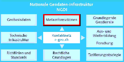 - Metadaten verweisen auf die die Geodaten selber - falls diese frei zugänglich sind. Auf Geodaten wird entweder direkt (z.B. ftp) oder mit den entsprechenden 'Data Access Services' (z.B. WMS/WFS) zugegriffen. Es gibt (in Zukunft) auch 'Filter Services' (z.B. OWS); das sind spezielle, eigenständige Geo-Webdienste, wie z.B. Koordinatentransformations-Webdienste.