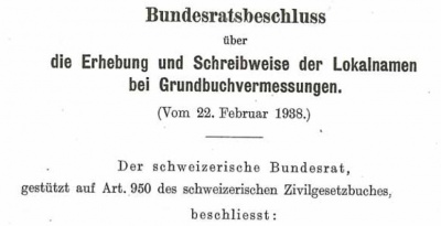 Der Bundesrat erkannte im BRB 22.2.1938 die Problematik, wenn Siedlungsnamen mundartlich geschrieben werden und verlangte gemäss Art. 5 und 7 im Bundesratsbeschluss vom 22. Februar 1938: Namen von bewohnten Orten (Siedlungsnamen), welche im Gebrauch der Bundesverwaltung stehen, sind dem Bund zu Vernehmlassung vorzulegen.