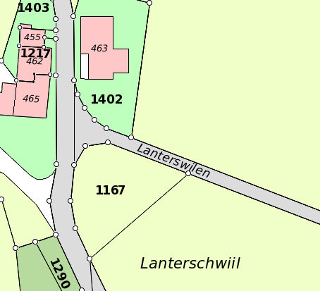 Lanterschwiil als Lokalname und Lanterswil als Strassenbezeichnung (Gebrauchsname) in der amtlichen Vermessung (ThurGIS) sowie Lanterswilen auf dem Wegweiser