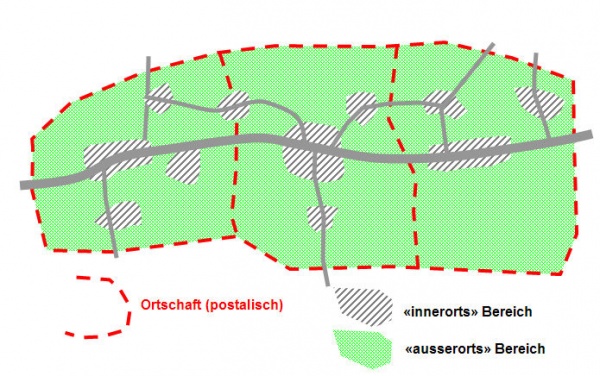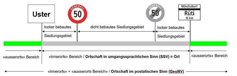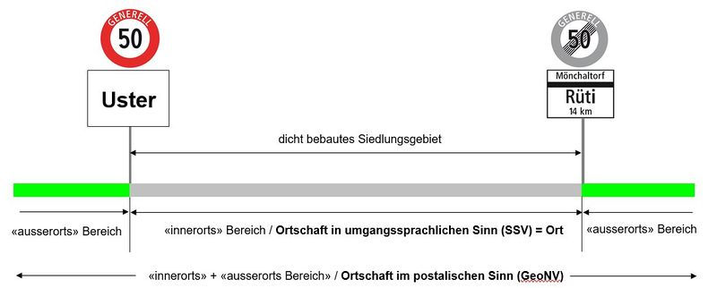 - Aus den Bestimmungen über die Signalisation der generellen Höchstgeschwindigkeit geht hervor, dass Ortstafeln Orte und nicht postalische Ortschaften signalisieren (vgl. hier)