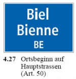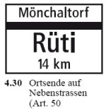 - Signal «Ortsbeginn» (4.27+4.29) signal «Début de localité»/«segnale Inizio della località», Signal «Ortsende» (4.28+4.30) signal «Fin de localité»/«segnale Fine della località» (Art. 1 Abs. 4 SSV)