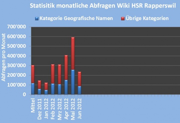 In der Periode Dezember 2011 bis Juni 2012 wurde eine Statistik über Abfragen des Wiki HSR nach Kategorie Geografische Namen und übrigen Kategorien durchgeführt. In dieser Periode erfolgten im Wiki HSR gesamthaft über 200'000 Abfragen im Durchschnitt pro Monat.