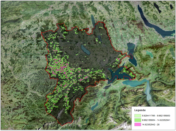 Die restlichen Daten waren als shape-Daten vorhanden. Diese mussten für die Erstellung der abschliessenden Bewertungskarte in Rasterkarten umgewandelt werden. Vor der Umwandlung wurden die Daten mit einer neuen Attributspalte „Wertung“, welche gemäss Bewertungsraster ausgefüllt wurde, ergänzt.