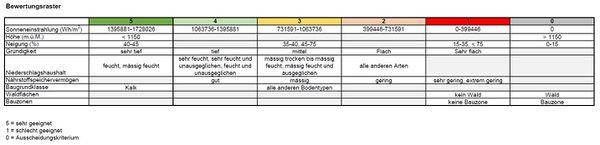 Die vorangehenden Kriterien und Anforderungen wurden anhand einem Punktesystem (von 1 (sehr schlecht) bis 5 (sehr gut)) bewertet. Die Ausscheidungskriterien (Waldflächen und Bauzonen) wurden mit den Punkten 1 oder 0 bewertet. Dabei gilt 1 als geeignet und 0 als Ausscheidungskriterium.