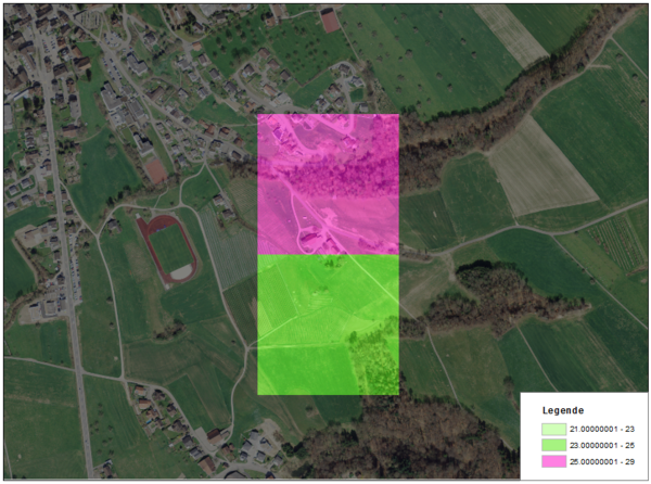In einem nächsten Arbeitsschritt wurden die beiden erstellten Rasterkarten (Sonneneinstrahlung und Neigung) mit dem Tool „Reklassifizieren“ bearbeitet. Damit wurden die Werte (Sonneneinstrahlung bzw. Neigung) gemäss Bewertungsraster (siehe Arbeitsschritt 1) neu klassifiziert. „no data“ wurden dabei mit der Zahl 0 versehen.