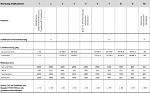 Als Erstes wurden Indikatoren für die Eignung von verdichtet gebauten Gebieten aufgestellt. Den verschiedenen Ausprägungen dieser Indikatoren wurden nachfolgend Punkte von 1 (schlecht) bis 10 (sehr gut) verteilt. Die untenstehende Tabelle zeigt das Resultat von Arbeitsschritt 1.