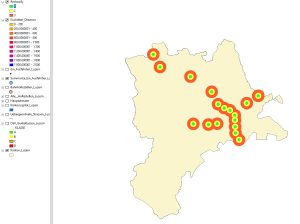 Mit dem Werkzeug Reclassify, welches bei Spatial Analysis Tool unter Reclass zu finden ist, können die Rasterfiles mit einer Bewertung versehen werden. Dazu wurden Einzugsbereiche von den Ein- und Ausfahrten, den Bahnhaltestellen sowie der Hauptstrassen definiert. Die ersten beiden in Form von Radien und die Hauptstrassen Anhand von Linearen Buffer. Die OeV Güteklassen bekamen eine zusätzliche Spalte in der Attributtabelle mit einer Wertung Anhand der Güteklassen A-D und konnten mit den Werkzeug Polygon to Raster in ein Rastefile konvertiert werden.