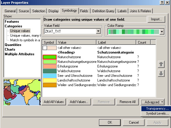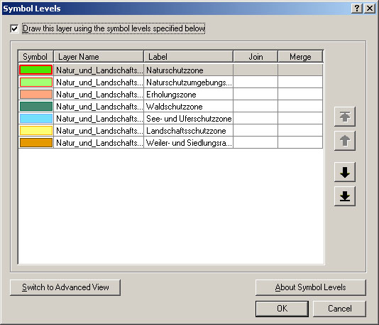 Sollen aneienandergrenzende Polygone neben der Flächenfarbe auch durch besondere Umrisslinien voneienander abgegrenzt werden, dann muss die Zeichenporiorität jedes einzelnen Symboles eines LAyers manuelle festgelegt werden.