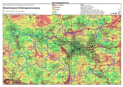 Die Faktoren Radwege, Wanderwege, Sportanlagen und Aussichtspunkte werden addiert und einfach gewichtet. Der Faktor Lärm wird mit dem Faktor 3 gewichtet und subtrahiert. Daraus ergeben sich die Potentialflächen.