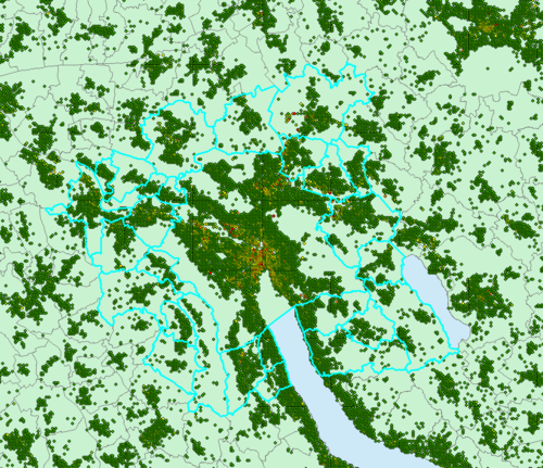 Die Ausgangslage stellen die Hoheitsgrenzen sowie die Beschäftigtendichte der Schweiz. Im Bild ist die Stadt Zürich und die umliegenden Gemeinden bereits markiert. Die Punkte bilden die Beschäftigtendichte. grün heisst geringe Beschäftigtendichte, gelb mittlere Beschäftigtendichte und rot sehr hohe Beschäftigtendichte.