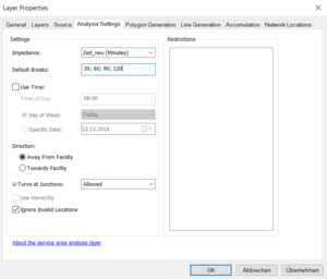 Ausgangspunkte definieren, massgebendes Attribut wählen, Einzugsgebiete definieren und dessen Darstellung einstellen, Berechnung starten: