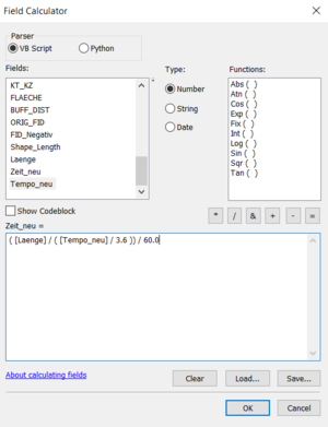 Mit dem "Field Calculator" kann in der Tabellenspalte "Fahrzeit" die Zeit errechnet werden, die benötigt wird, um das jeweilige Strassenteilstück zu befahren. Dazu wird folgende Formel hinterlegt: