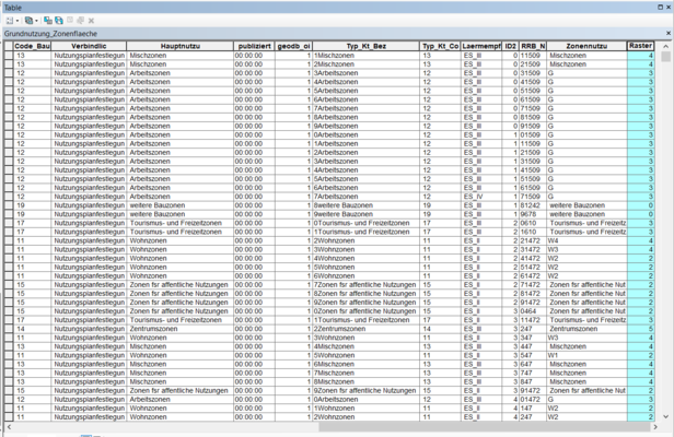 Für die Kategorisierung der einzelnen Takte wird in der Attribut Tabelle des Layers Bauzonen Kanton Schwyz eine weitere Spalte hinzugefügt. Diese Spalte wird mit dem Namen Raster beschrieben. In dieser Spalte fügt man jetzt jeder Bauzone die entsprechende Bewertung zwischen 1 und 5 hinzu. So erhalten die Mischzonen die Punktzahl 4 und die Gewerbezonen die Punktzahl 3.