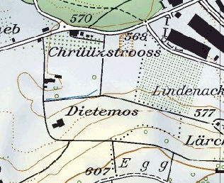 | Dietemos in der Landeskarte | Dietenmoos als Adresse in map.serch.ch (gefunden wird Gebäude oben), Dietemos als Flurname (gefunden wird Gebäude unten) |