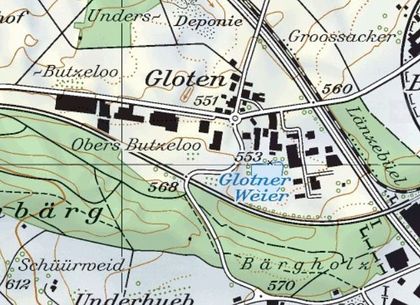 | Auf der Landeskarte erscheint nicht Gloote sondern Gloten | Gloten in map.search.ch, wo Gloote jedoch nicht gefunden wird |