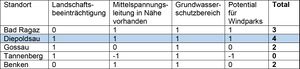 In St. Gallen sind erstaunlich viele Flächen vorhanden, die nicht durch die harten Kriterien vom Bau von Windenergieanlagen ausgeschlossen werden. Bei einer entsprechend strengen Anwendung der weichen Kriterien (mind. 900 von 1000 Punkten) fallen aber viele Gebiete weg. Die grössten übrigbleibenden Gebiete, die eine gute Nutzungseignung zur Windenergieproduktion aufweisen, sind in den Talebenen des Rheins (bei Bad Ragaz und Diepoldsau) und der Linth (bei Benken) zu finden. Zwei weitere potentielle Standorte befinden sich im Norden des Kantons, im Gebiet Tannenberg und nördlich von Gossau. Gewisse Kriterien konnten bei der Standortevaluation nicht miteinbezogen werden, da die nötigen Datengrundlagen fehlten oder der Bund uns diese nicht zur Verfügung stellen wollte. Aus diesem Grund wurden die fünf evaluierten Standorte anschliessend qualitativ bewertet (siehe Tabelle rechts):